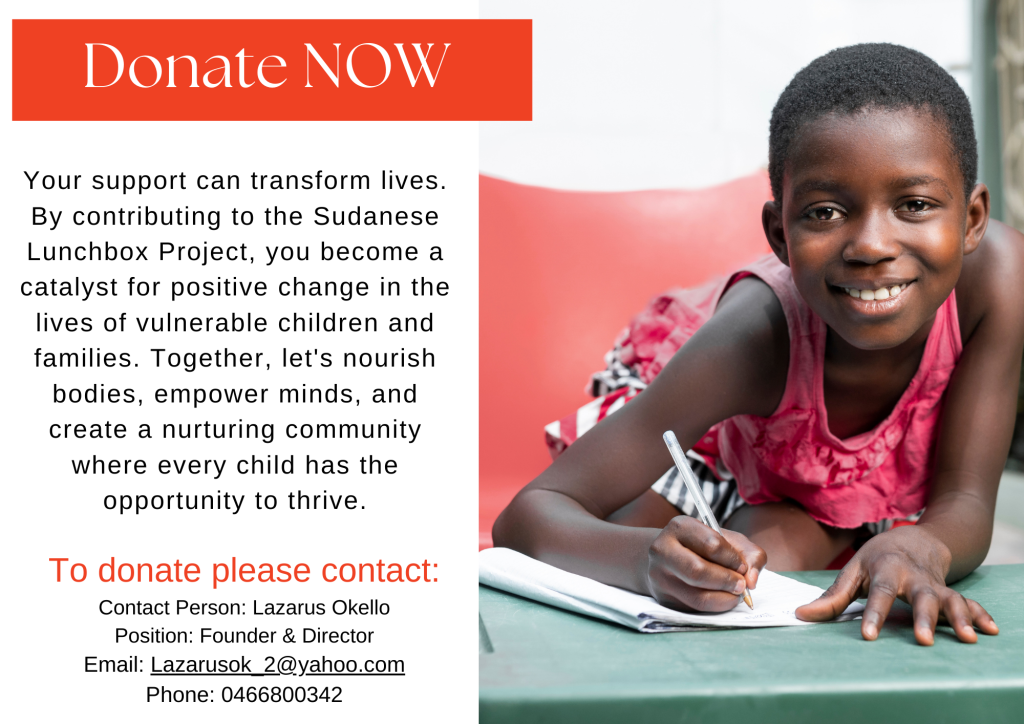 The Sudanese Lunchbox Project is driven by a compelling mission: ensuring no child goes hungry at school. Sudanese refugees encounter various hurdles like seeking housing, employment, and accessing support services such as Centrelink. KYDO acknowledges the importance of occasional assistance and strongly believes that nurturing both body and mind is crucial for a child’s holistic well-being and academic achievement. Through supplying nutritious meals during school hours, our goal is to boost children’s focus, enhance their comprehension, and cultivate a positive learning atmosphere.
